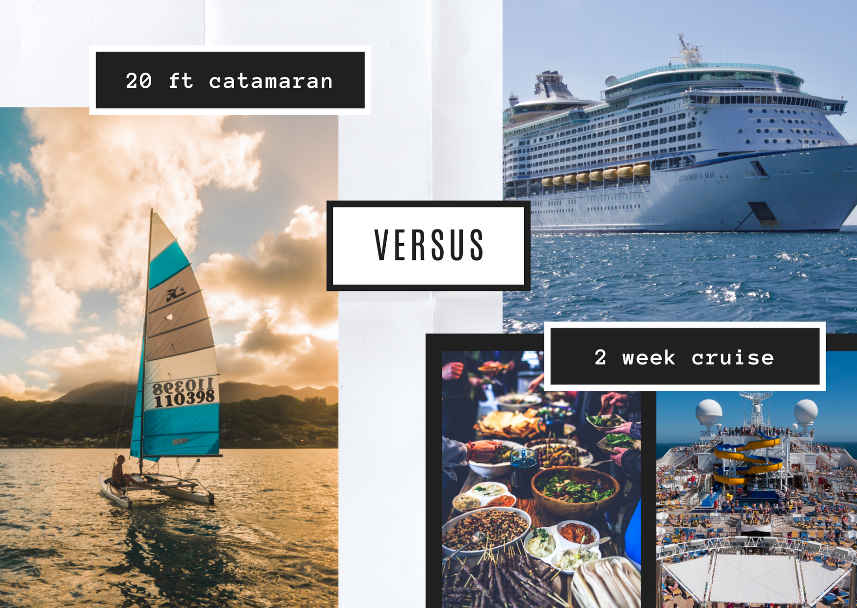I might place more value on the two-week cruise because I’d get to travel and stop at ports and have unlimited buffets and all that stuff the cruise ships do. From my perspective, that looks like the better experience because I’m getting SO MUCH MORE. But my patient places more value in the experience of sailing and can’t get that with the two-week cruise extravaganza. From my patient’s perspective, the 20-foot catamaran would be the better experience based on their values. In all honesty, me too. #teamcatamaran